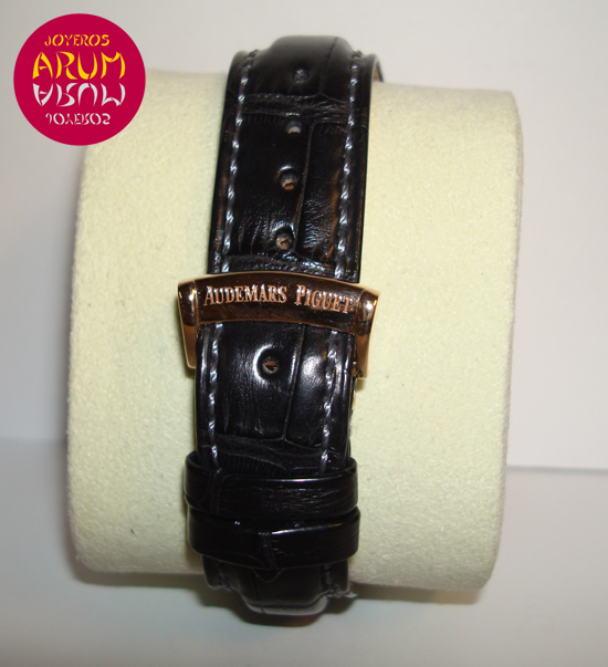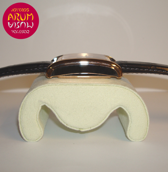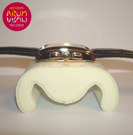 Description :pink gold, black dial, sapphire crystal, automatic movement, caliber 2385, chronograph, minutes indicator at three, hours indicator at nine, small seconds at six, date between four and five, luminescent handles and dial indicators, screw crown and two buttons at right, diameter 29 mm by 35 mm, original black leather strap, rose gold folding clasp, year 2000.