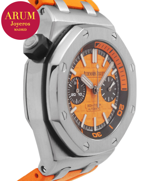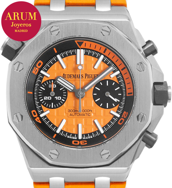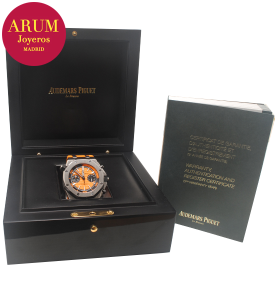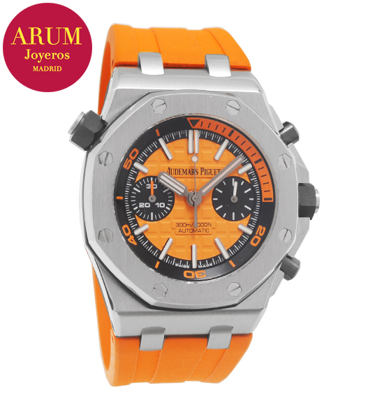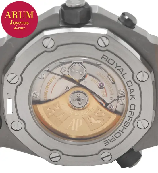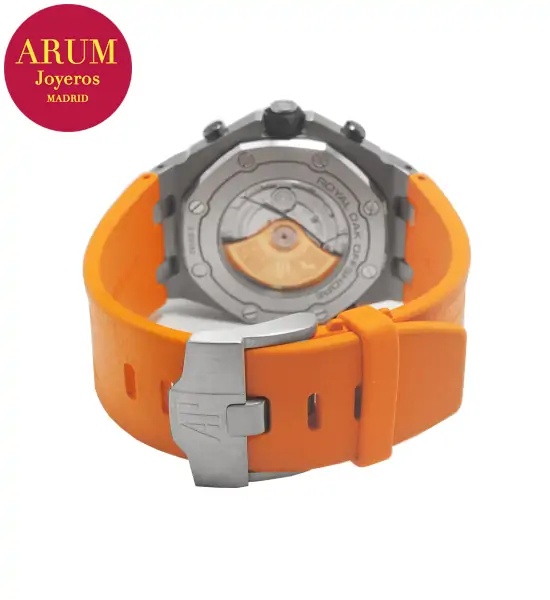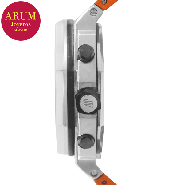 Other specifications :limited edition 375 for AP boutiques, calibre 3124/3841, power reserve 30 hours, chronograph, minute counter, small seconds, luminous marks, rotating bezel with left crown, transparent caseback. Year 2016.
