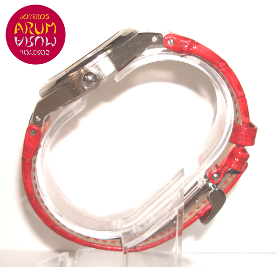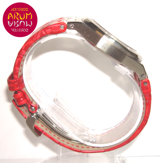 Description :ladies watch, steel, black dial, octagonal bezel, sapphire crystal, quartz movement, date at three, screw crown, diameter 33 mm, waterproof 50 meters, red leather strap, steel folding clasp, year 2008.