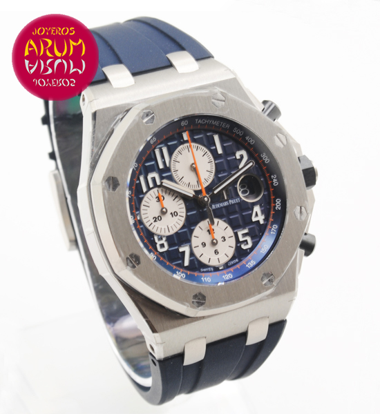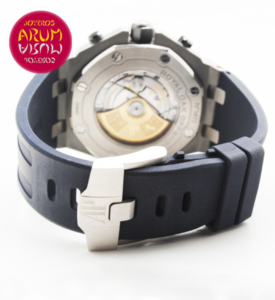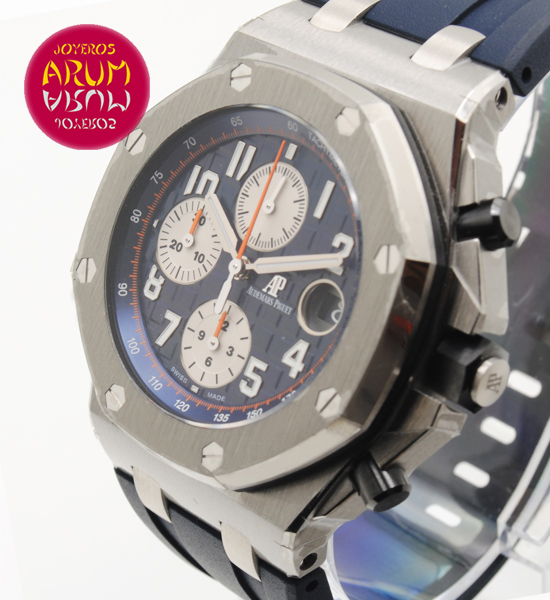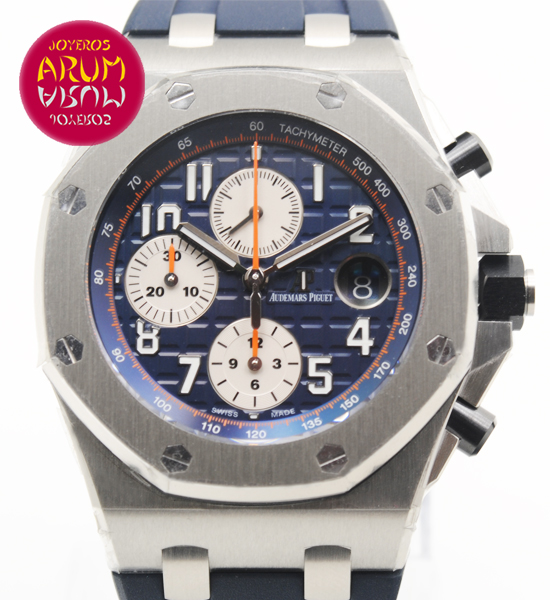 Other specifications :calibre Audemars Piguet 3126 / 3840, octagonal screw bezel, chronograph, tachymetre, date at three, small seconds at twelve, hour counter at six, minute counter at nine, orange details, luminiscence marks, ceramic crown and buttons, transparent caseback. August/2014.
