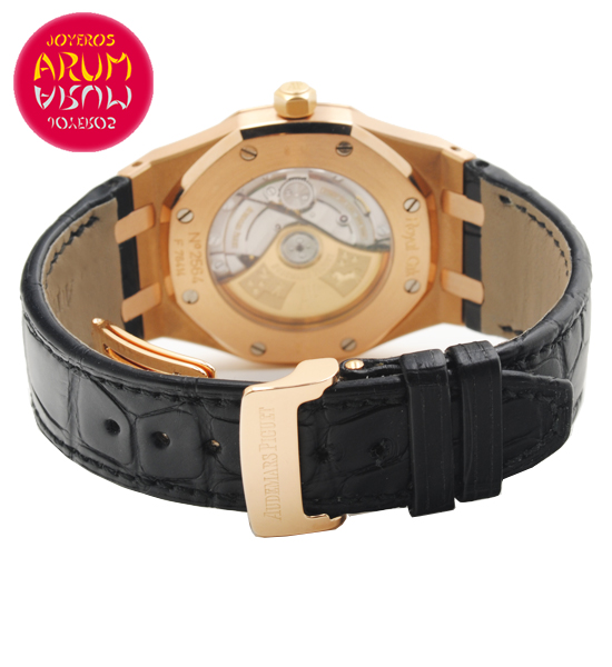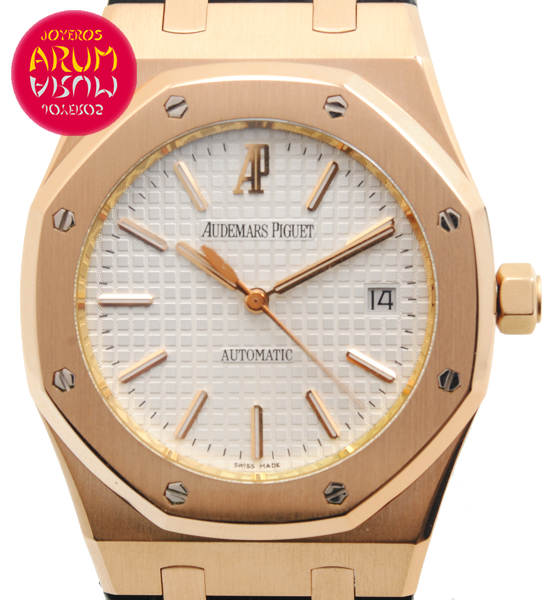 Other specifications :calibre 3120, octagonal screw bezel, central seconds, date at three, luminiscence marks, original strap and buckle Audemars Piguet, 18K rose gold folding clasp.