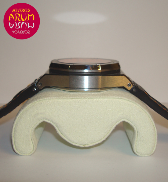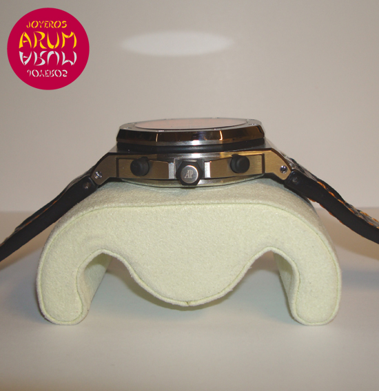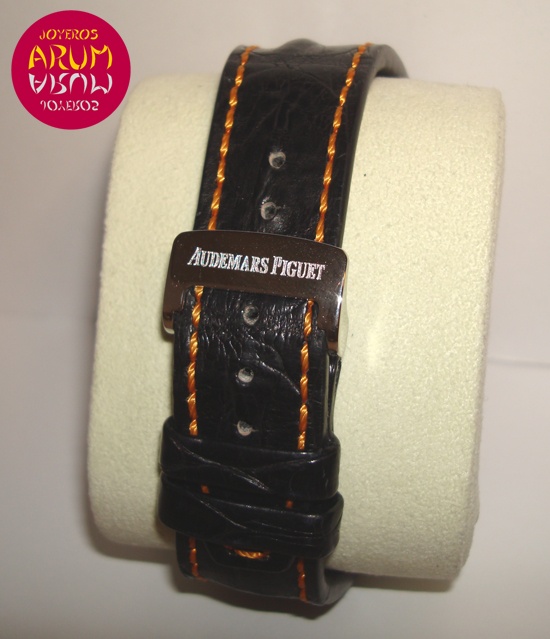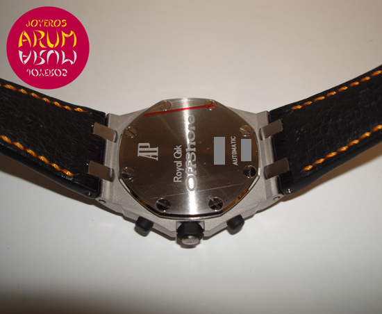 Description :steel, black dial grid, handles and numbers in orange, octagonal screwed bezel, sapphire crystal, automatic movement, caliber AP 3126/3840, chronograph, three indicators on the dial, seconds, minutes, hours, date at three, diameter 42 mm (without crown), crown and pushers with rubber protectors, waterproof 100 meters, black leather strap, steel folding clasp.