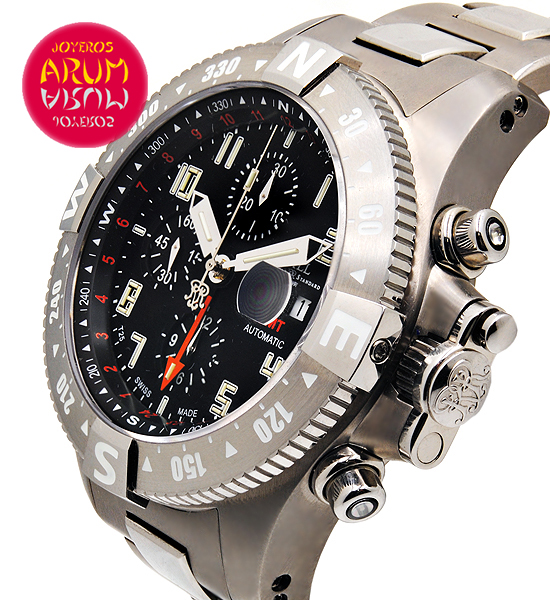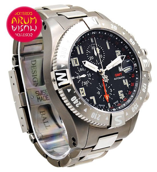 Other specifications :calibre Ball RR1404, shock resist, antimagnetic, resistant to extreme temperatures, rotating bezel in both directions, chronograph, GMT (second time zone), date at three, luminiscence with gas microtubes, steel and titanium strap. Year 2014.