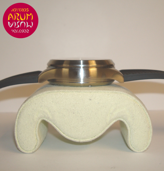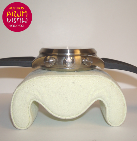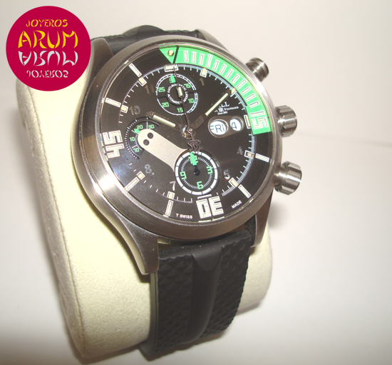 Description :steel, black dial, smooth bezel, sapphire crystal, automatic movement, caliber ETA 7750, 56 micro gas tubes for excellent luminescence, shock resistant, antimagnetic, chronograph, minutes indicator at twelve, hour indicator at six, small seconds at nine, date and day of week at three, diameter 43.8 mm, waterproof 100 meters, auxiliary crown at four to regulate the inner bezel, rubber strap, buckle closure.