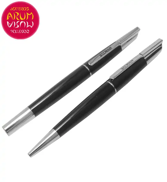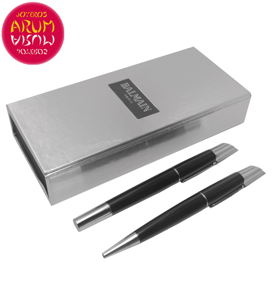 Product: Ballmain Writing SetShop Reference: RAJ1971Description: Ballmain writing set, roller and ballpoint, made in black resin and plaqué platinum details. Condition: Like new, with Balmain.