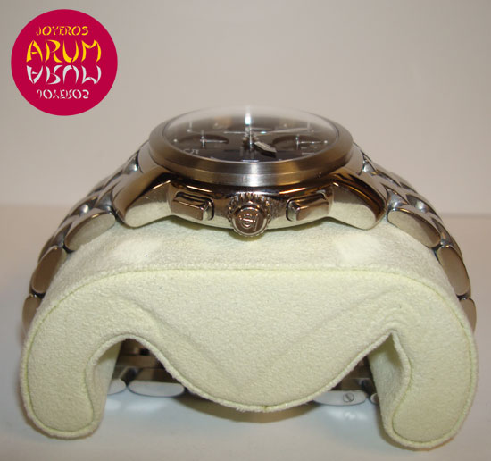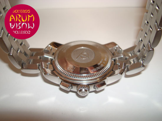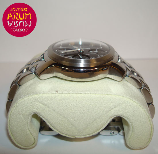 Description :steel, black dial with arabic numerals, sapphire crystal, automatic movement, chronograph, three indicators on the dial, seconds, minutes, hours, date at three, handles and luminescent dial, screw crown and two buttons, diameter 38 mm, waterproof 100 meters, steel strap, hidden folding clasp, includes a second brown leather strap.