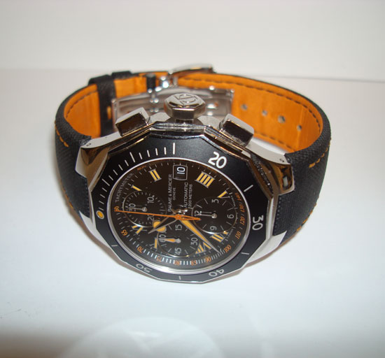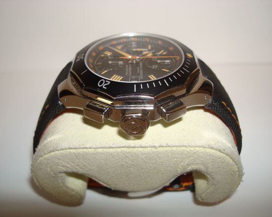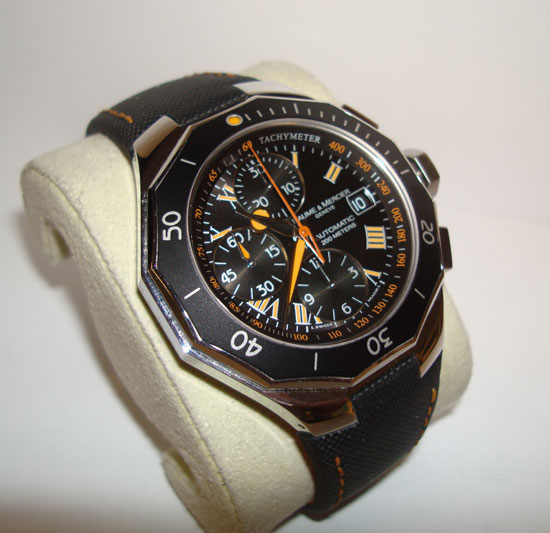 Description :steel, sapphire crystal, automatic movement, unidirectional rotating bezel, chronograph, 3 indicators on the dial, seconds, minutes and hours, tachometer, date at 3, luminescence, waterproof 200 meters, screw crown and two buttons, diameter 42 mm, strap of synthetic material, steel folding clasp.