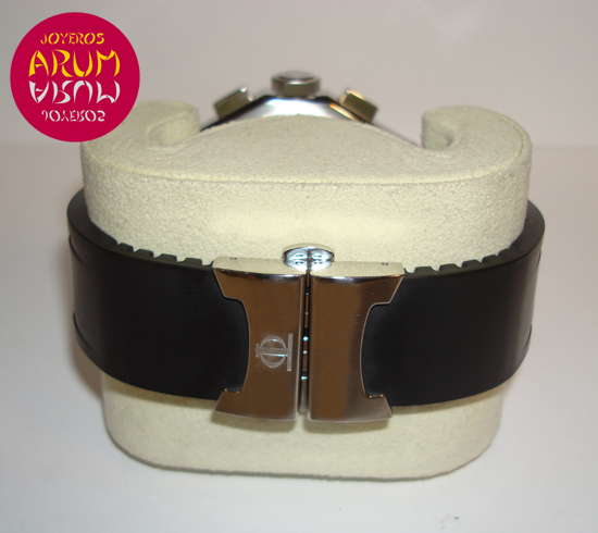 Description :steel, black dial, sapphire crystal, automatic movement, chronograph, three indicators on the dial, seconds, minutes, hours, date at three o’clock, luminescent dial and handles, screw crown and two buttons, diameter 43 mm, waterproof 100 meters, rubber strap, folding clasp, year 2007.