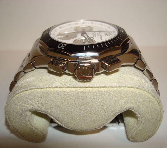 Description :steel, white dial, sapphire crystal, rotating bezel, automatic movement, chronograph, three indicators on the dial, seconds, minutes, hours, date at six o’clock, luminescent handles, waterproof 200 meters, diameter 41 mm, screw crown and two buttons , strap steel, folding clasp.