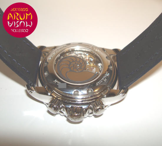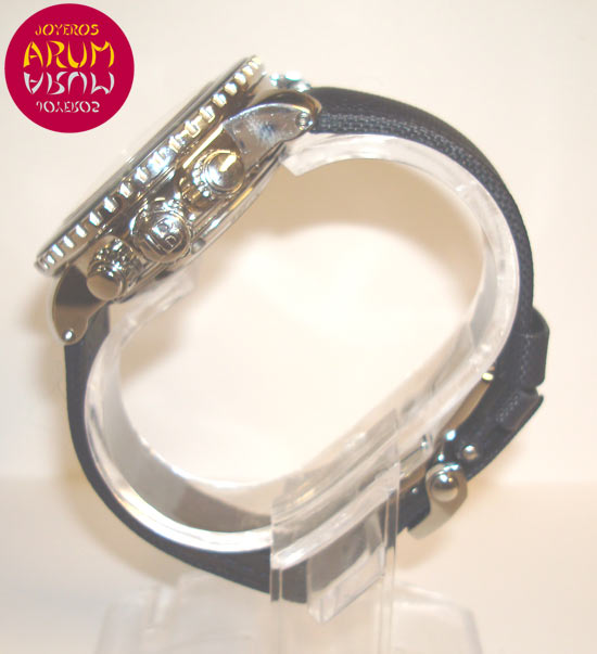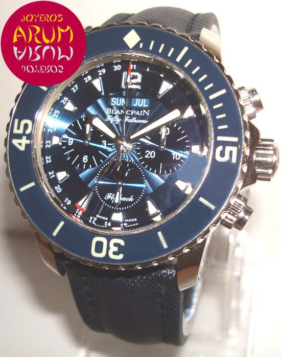 Description :steel, blue dial, unidirectional rotating bezel coated sapphire crystal, sapphire crystal, automatic movement, caliber 66BF8, power reserve 40 hours, chronograph, flyback function (different measurements in two clicks instead of the usual four of a chronograph ), minute indicator at three, hour indicator at nine, small seconds and moonphase at six, day and month at twelve, date indicated with central handle, luminescent indicators in dial, bezel and handles, screw crown and two buttons at the right, diameter 45 mm, waterproof 300 meters, blue textile strap, steel folding clasp, includes a second strap special diving.