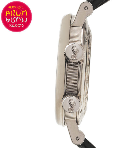 Other specifications :caliber 519F, power reserve of 45 hours, GMT (second time zone) function, alarm, date at six, power reserve indicator, small seconds, blue steel hands, transparent caseback, folding clasp in 18K white gold.