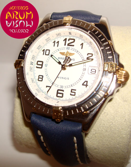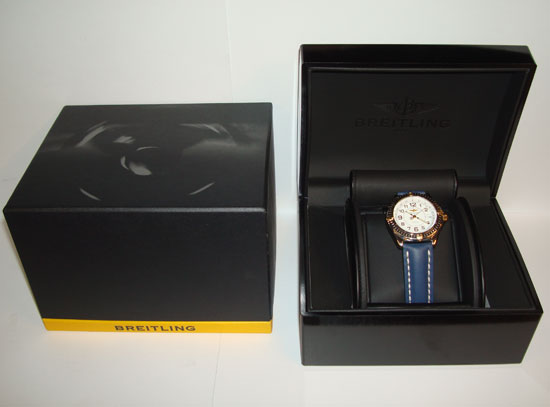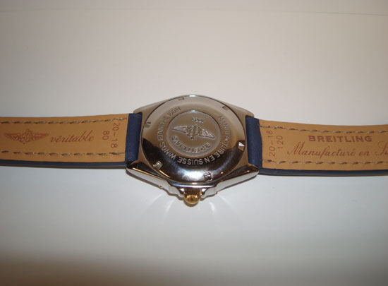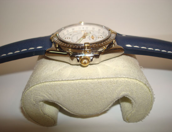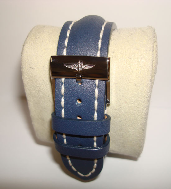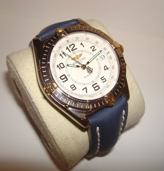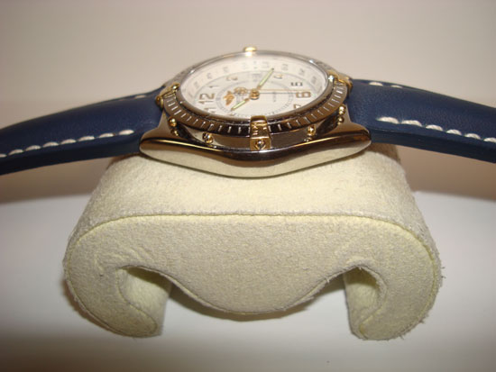 Description :steel case, rotating bezel with indicators in gold, white dial with numbers, sapphire crystal, quartz movement, center seconds, luminescent handles indicators, date at three, 37 mm diameter, screw crown, blue leather strap, close steel buckle.