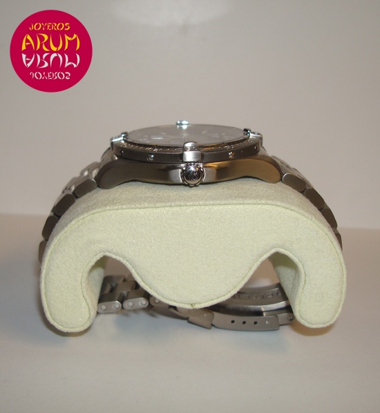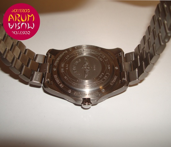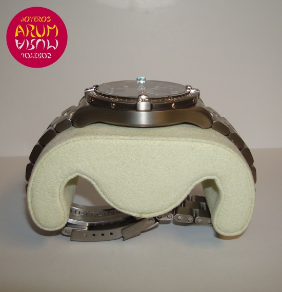 Description :titanium, black dial, sapphire crystal, rotating bezel, quartz movement, analog and digital functions, luminescence, chronometre, countdown, date, weekday, alarm, GMT (dual time), crown at right, water resistant 100 meters, diameter 42 mm, titanium strap, folding clasp.