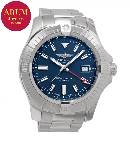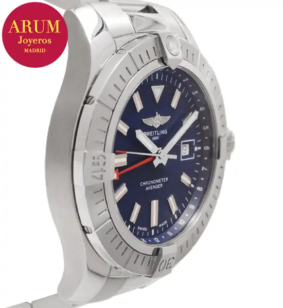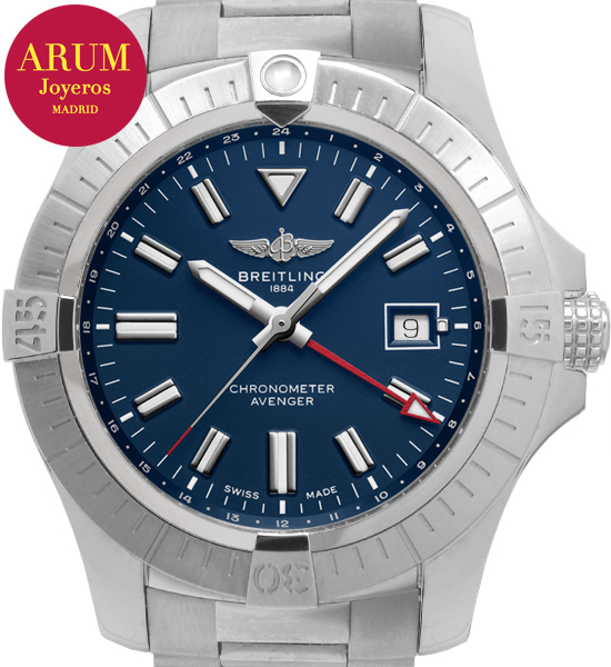 Other specifications :calibre Breitling 32, power reserve 42 hours, GMT, date, central seconds, luminous marks, rotating bezel, screw crown.