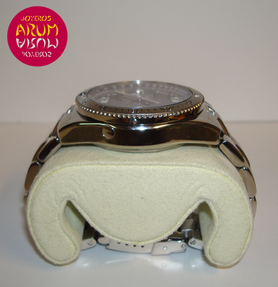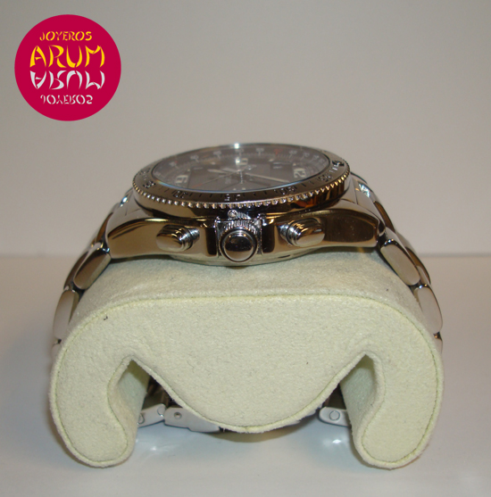 Description :steel, black dial, rotating bezel, digital / analog, sapphire crystal, quartz movement, chronograph, date, calendar, GMT, am / pm, alarm, luminescence dial and handles, crown and two buttons to the right, diameter 42 mm, waterproof 30 meters, steel bracelet, folding clasp.