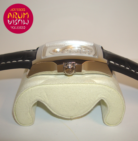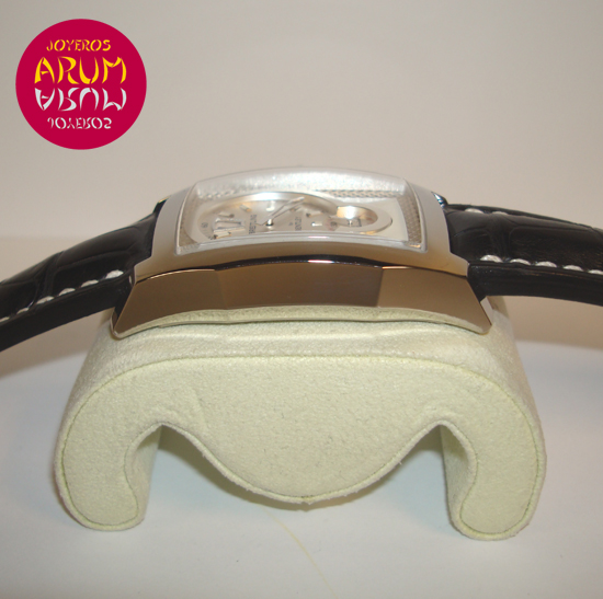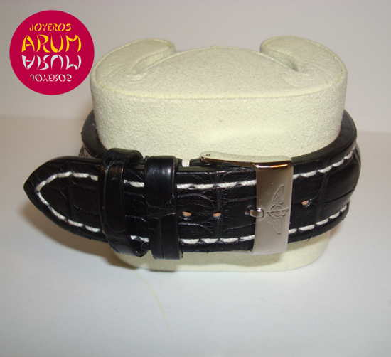 Description :steel, white dial, mother of pearl dial indicators, sapphire crystal, automatic movement, power reserve 42 hours, hour indicator at 12 with “jump system”, minutes indicated with central handle, small seconds at six, 38.5 mm diameter, 100 meters waterproof, blalck leather strap, steel buckle closure.