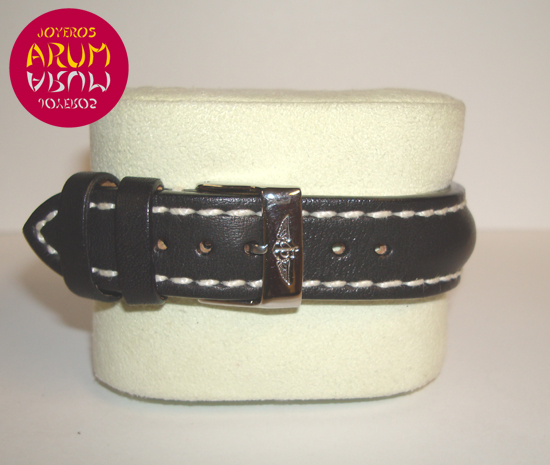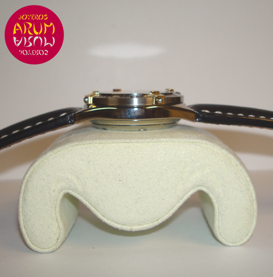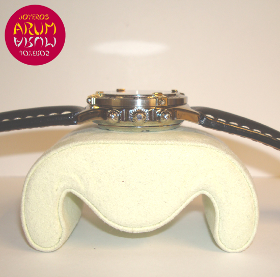 Description :steel and gold, blue dial, rotating bezel, sapphire crystal, manual movement, chronograph, three indicators on the dial, seconds, minutes and hours, handles and luminescent dial, screw crown and two buttons, diameter 35 mm, leather strap, black buckle closure.