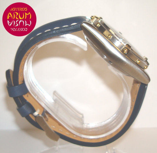Description :steel and yellow gold, blue dial, rotating bezel, sapphire crystal, automatic movement, chronograph, three indicators on the dial, minutes at twelve, hours at six, small seconds at nine, date at three, screw crown and two buttons, diameter 39 mm, waterproof 100 meters, blue leather strap, buckle closure.