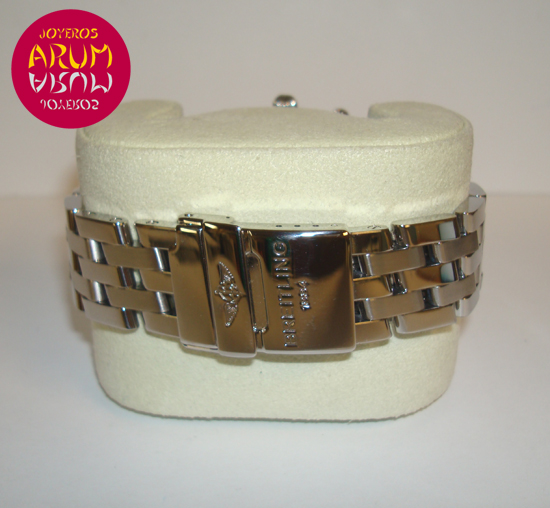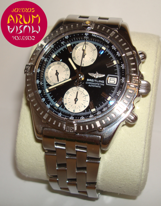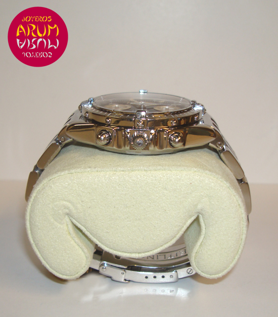 Description :steel, black dial, sapphire crystal, automatic movement, rotating bezel, chronograph, 3 indicators on the dial, seconds, minutes, hours, date at three, handles and dial with luminescent indicators, screw crown and two buttons, diameter 39 mm , waterproof 100 meters, steel bracelet, folding clasp, year 2010.