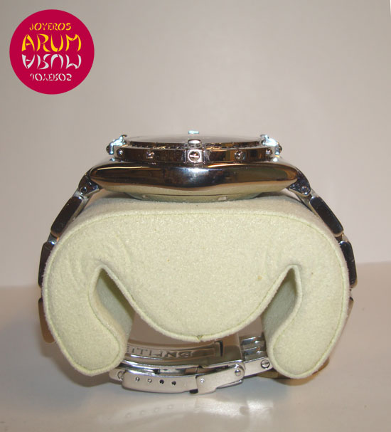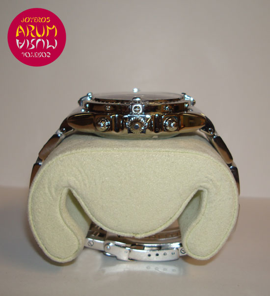 Description :steel, blue dial, rotating bezel, sapphire crystal, automatic movement, chronograph, three indicators on the dial, seconds, minutes and hours, date at three, luminescent handles, screw crown and two buttons at right, diameter 38 mm, waterproof 100 meters, steel strap, steel folding clasp.