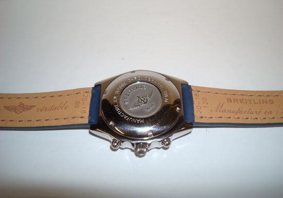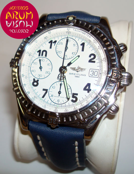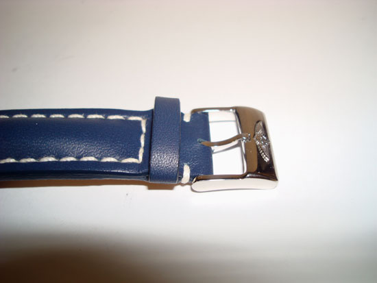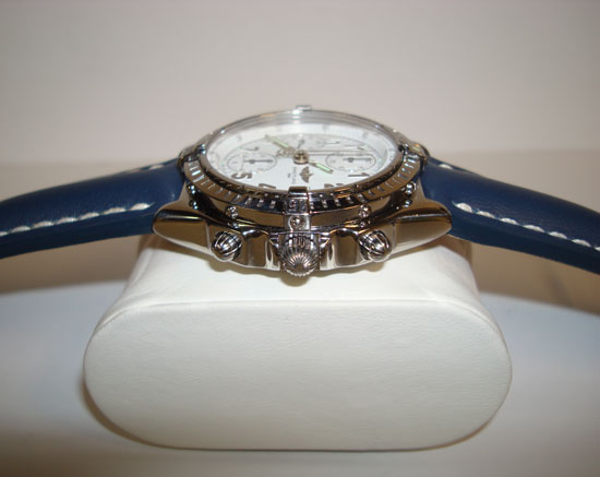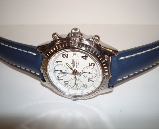 Description :steel, white dial, rotating bezel with luminescent indicator, automatic, 3 indicators on the dial, seconds, minutes and hours, chronograph, date, luminescent handles, diameter 39 mm, blue leather strap, steel buckle closure.