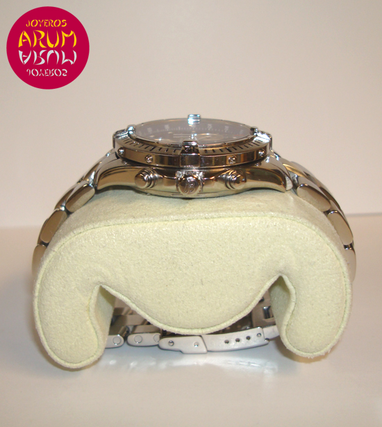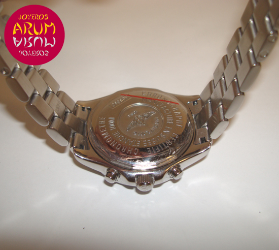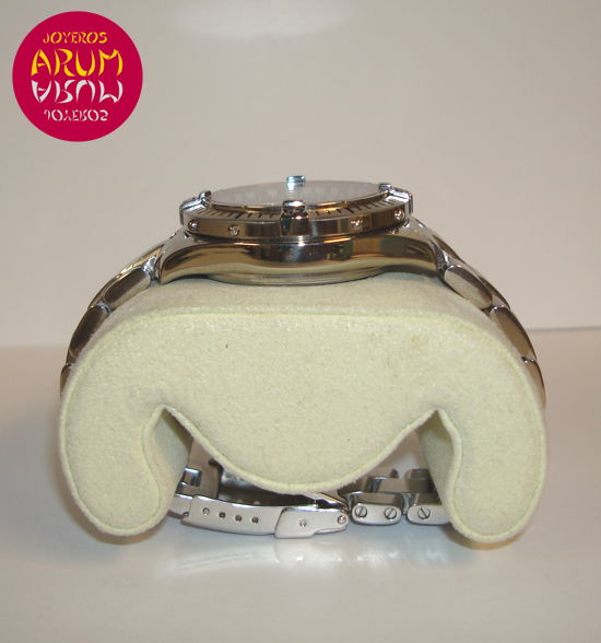 Description :steel, blue dial, rotating bezel, sapphire crystal, quartz movement, handles and luminescent dial indicators, chronograph, three indicators on the dial, seconds, minutes, hours, date between four and five, screw crown and two buttons , diameter 38 mm, waterproof 100 meters, steel bracelet, folding clasp, year 2001.