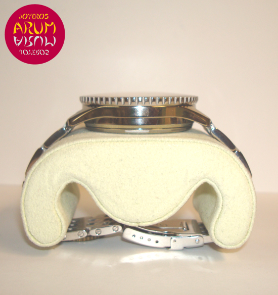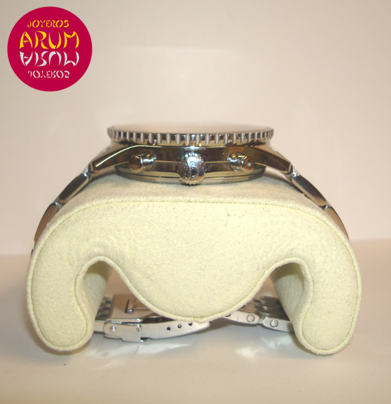 Description :steel, black dial, sapphire crystal, automatic movement, chronograph, three indicators on the dial, seconds, minutes, hours, date between four and five, handles and luminescent dial, screw crown and two buttons, 41.5 mm diameter, waterproof to 30 meters, steel strap, folding clasp, year 2006.