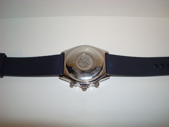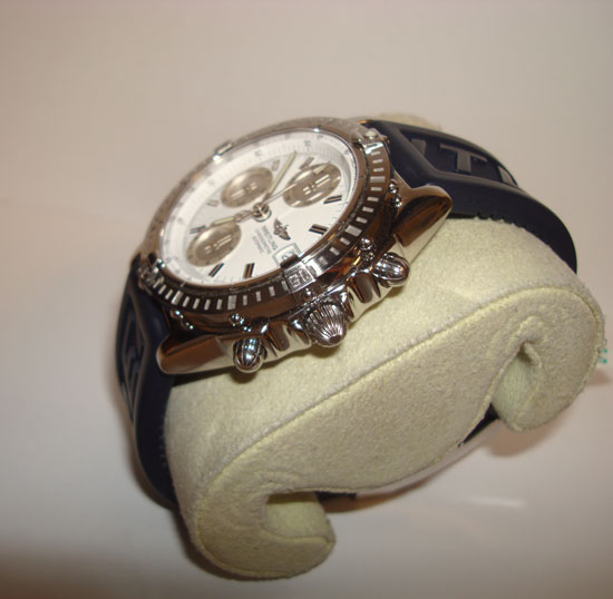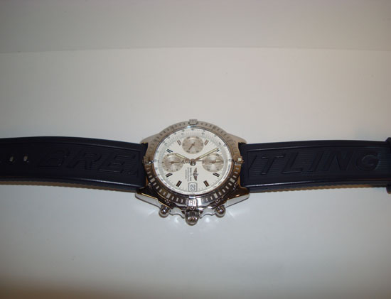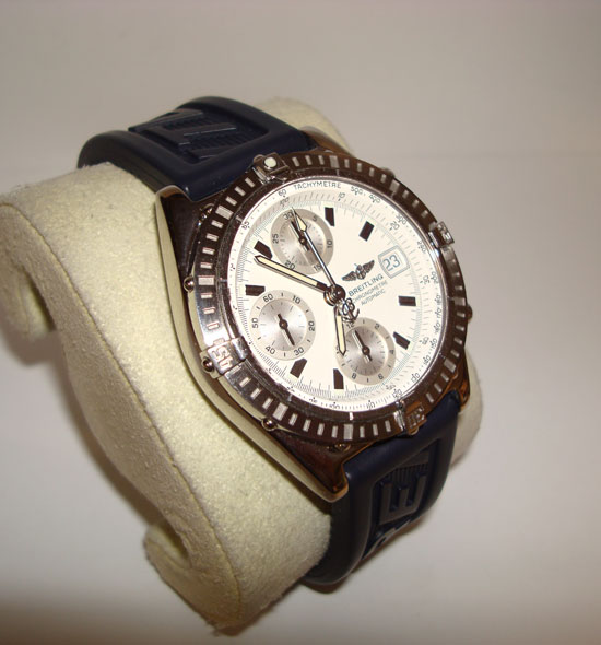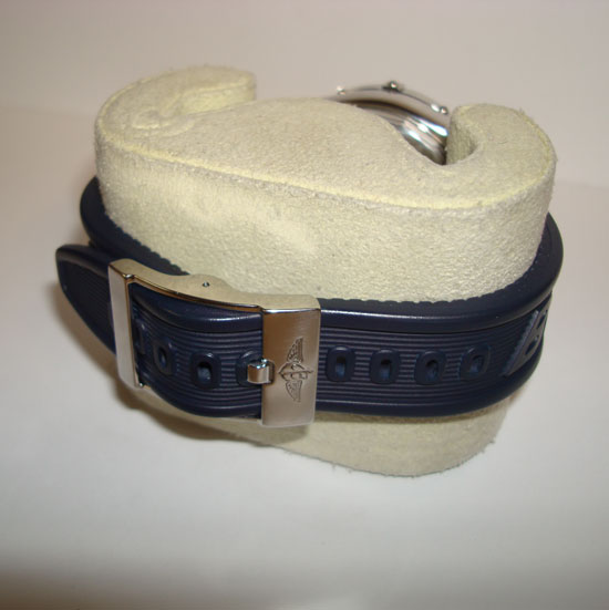Description :steel, white dial, rotating bezel, sapphire crystal, automatic movement, chronograph, 3 indicators on the dial, minutes, seconds and hours, date, diameter 39 mm, waterproof 100 meters, luminescence, crown caps and two buttons, rubber strap blue, steel buckle closure with the Breitling logo.