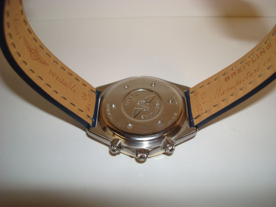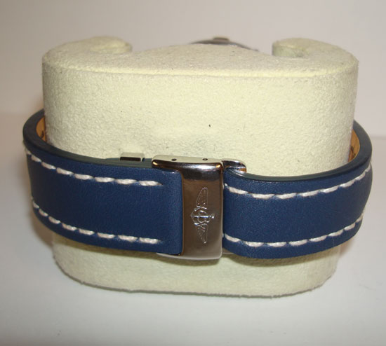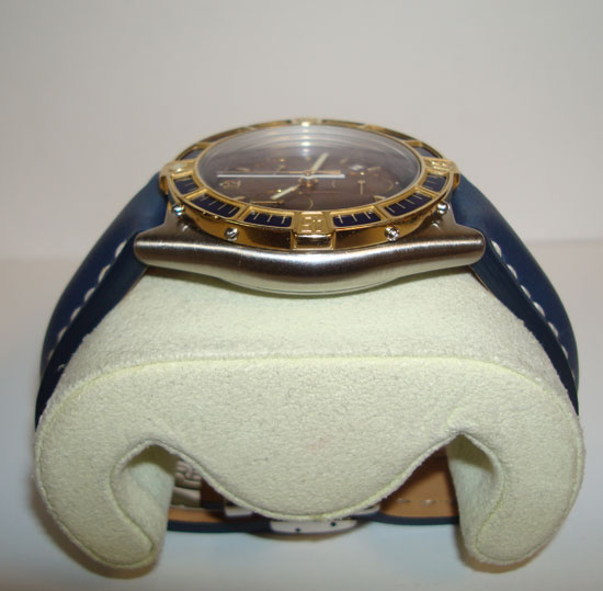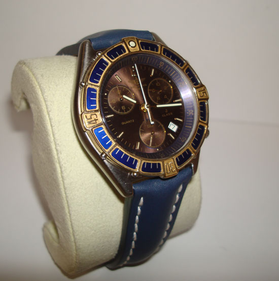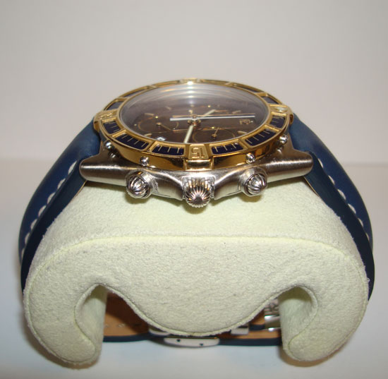 Description :steel and yellow gold, brown dial, sapphire crystal, quartz movement, rotating bezel, chronograph, three indicators on the dial, seconds, minutes, hours, date between four and five, handles and lumiscentes dial, crown and two buttons, 41 mm diameter, blue leather strap, steel folding clasp.