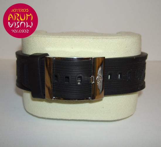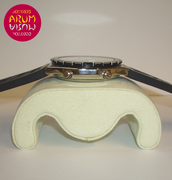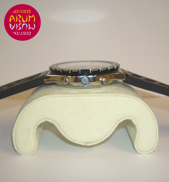 Description :steel, black dial, mineral crystal, rotating bezel, quartz movement, chronograph, date at four, handles and luminescent dial, diameter 41 mm, waterproof 100 meters, rubber strap, steel buckle.