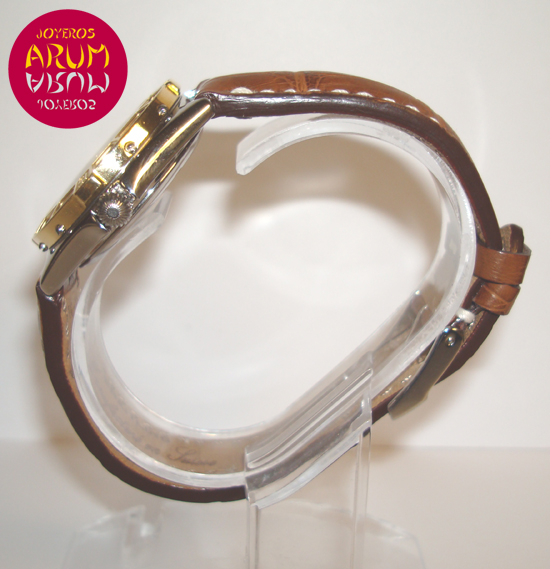 Description :ladies watch, steel and yellow gold, white dial, rotating blue bezel, sapphire crystal, quartz movement, center seconds, luminescent indexes and indicators handles, date at three, screw crown, diameter 30 mm, waterproof 200 meters, brown leather strap, buckle closure.