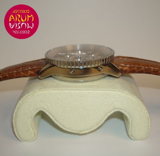 Description :limited edition of 1000 pieces, steel, blue dial, sapphire crystal, automatic movement, chronograph, seconds and date indicator at twelve, indicator 52 weeks at three, hours indicator and week day at six, minutes indicador and month at nine, luminescent handles, diameter 41 mm, waterproof 30 meters, brown leather strap, steel buckle closure.