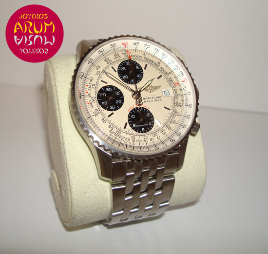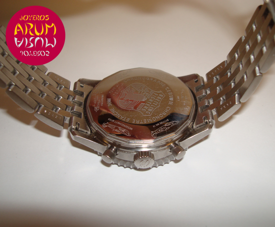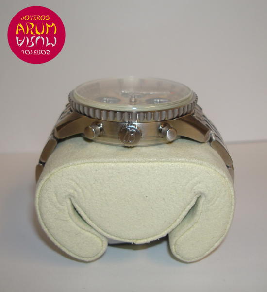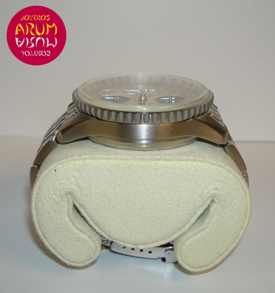 Description :steel, white dial, plexi glass, automatic movement, chronograph, seconds indicator at twelve, hour indicator at six, minute indicator at nine, date at three, luminescent handles, diameter 41 mm, 30 meters underwater, steel strap, folding clasp.