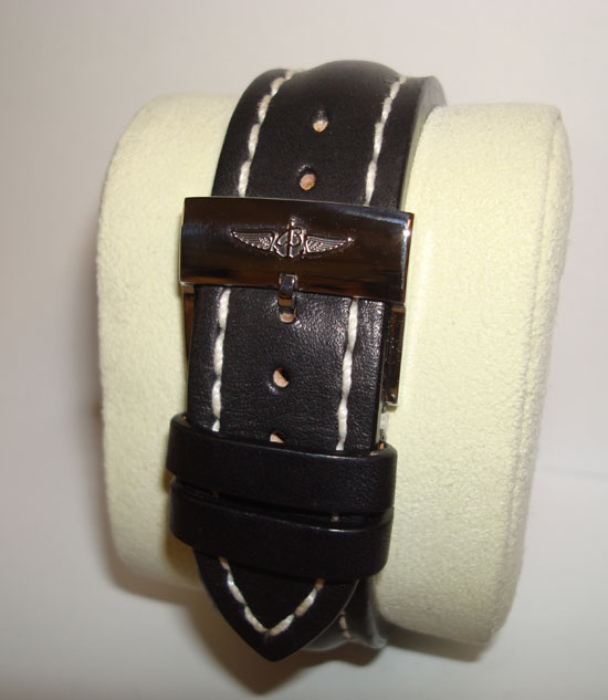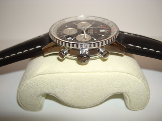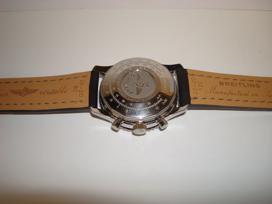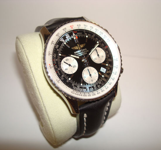 Description :steel, sapphire crystal, automatic movement, chronograph, three indicators on the dial, seconds, minutes, hours, date between four and five, luminescent handles, screw crown and two push buttons, diameter 41 mm, black leather strap, steel buckle close.