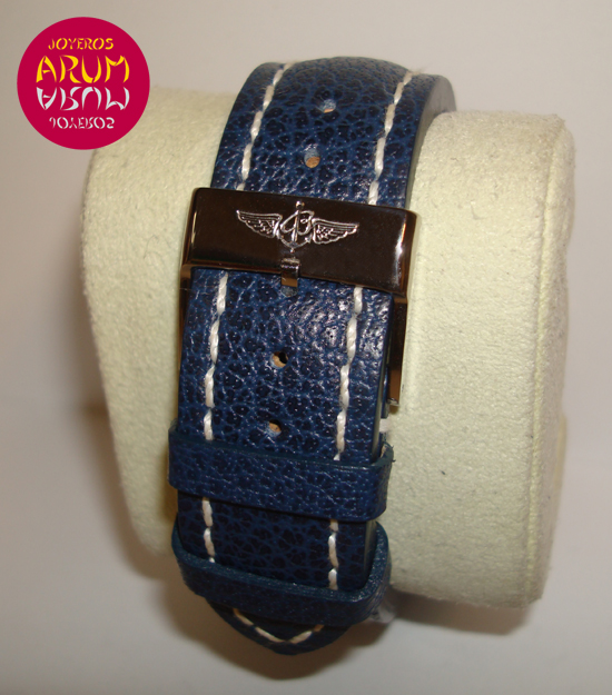 Description :steel, blue dial, sapphire glass antireflective, bidirectional rotating bezel, automatic movement, slide rules for navigation, chronograph, three indicators on the dial, seconds, minutes, hours, handles and luminescent dial, screw crown and two buttons, diameter 45 mm, blue leather strap, steel buckle closure, year 2008.