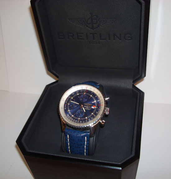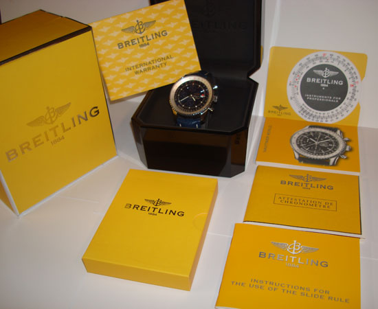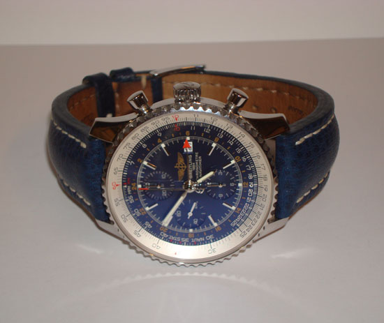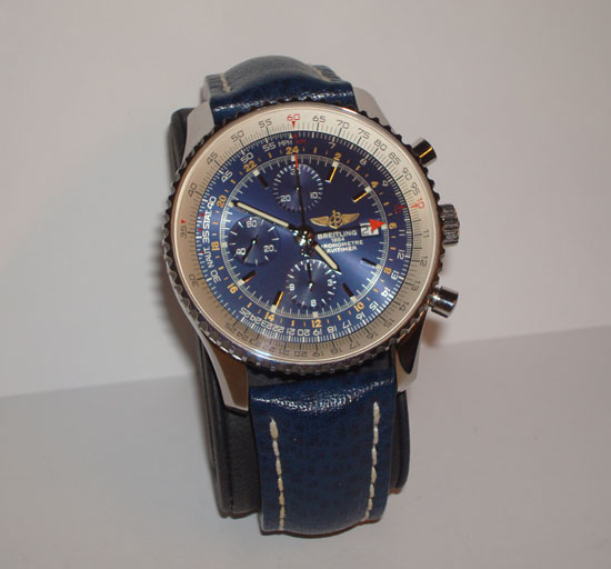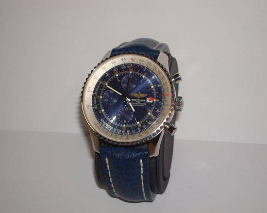 Description :available with two straps, steel, anti sapphire crystal, blue dial, chronograph, chronometer, date at 3 o’clock, luminescent hands, slide rule for functions of navigation, automatic bi-directional bezel, power reserve, leather straps and steel closure with Breitling logo.