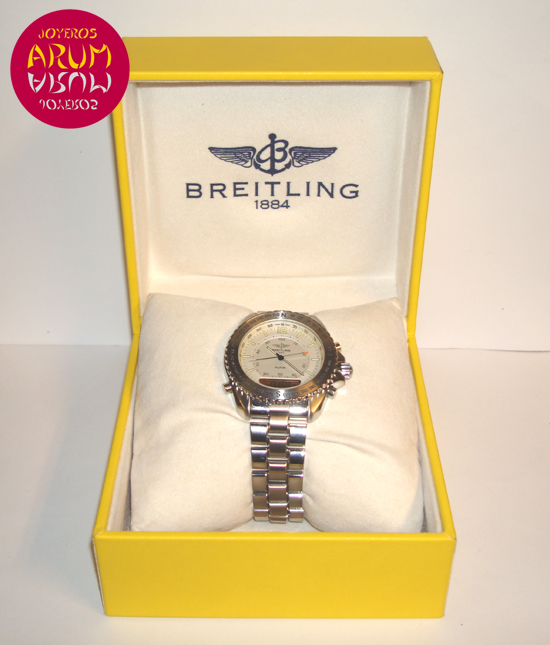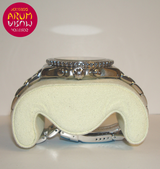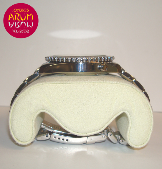 Description :steel, white dial, rotating bezel, sapphire crystal, quartz movement, center seconds, luminescent handles, digital functions at six, time indicator, date, alarm, three buttons and right crown, diameter 40 mm, waterproof 100 meters, steel strap folding clasp.