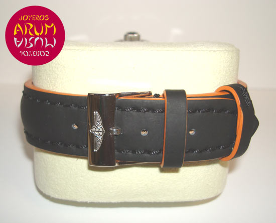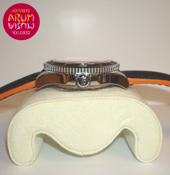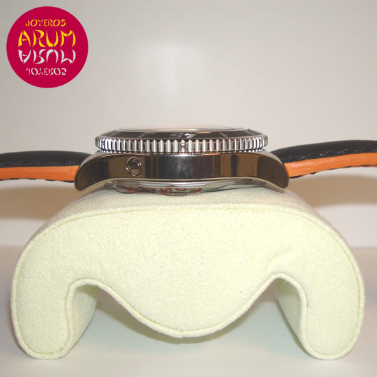 Description :limited edition 2000 pieces, steel, black dial, rotating bezel, sapphire crystal, automatic movement, power reserve 40 hours, central seconds, date at three, indicators and luminescent handles, screw crown, diameter 42 mm, water resistant 1500 meters, black and orange leather strap, buckle closure, year 2012.