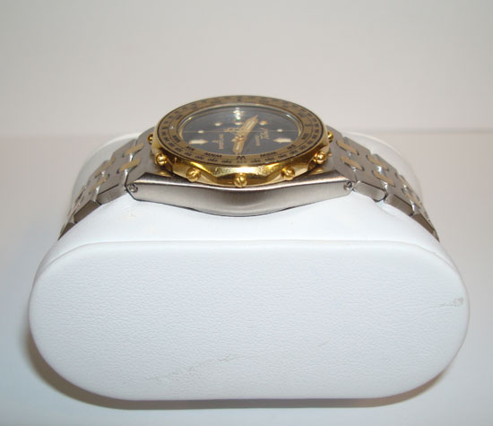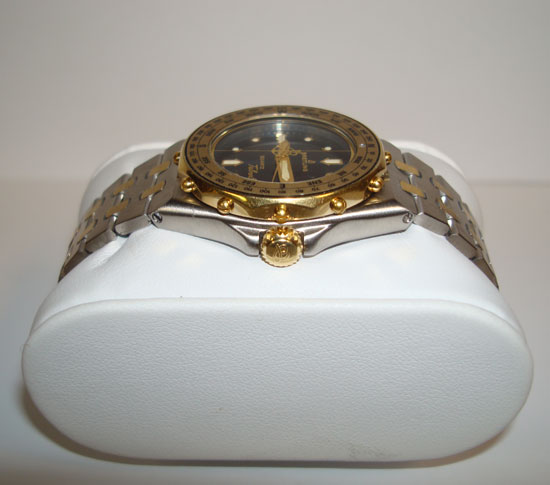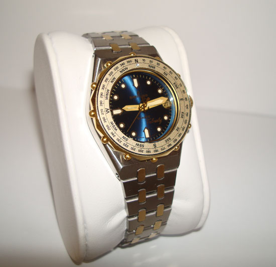 Description :lady’s watch, designed by Eric Tabarly, steel and yellow gold, bezel with compass, sapphire crystal, blue dial, quartz movement, central second, date at three, handles and luminescent dial, screw crown, diameter 27 mm, belt steel and yellow gold, folding clasp.