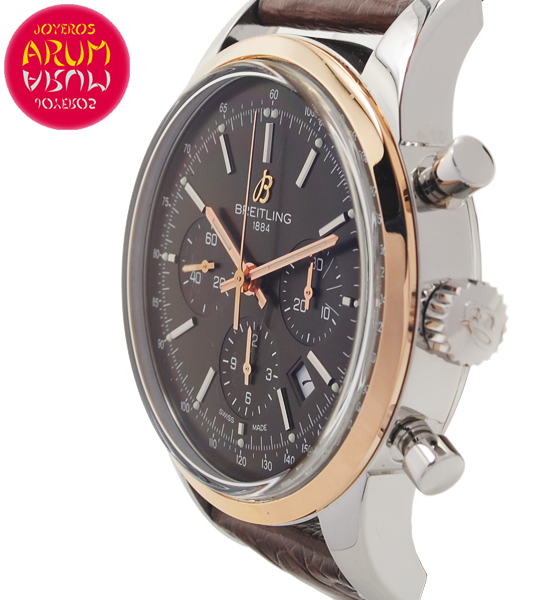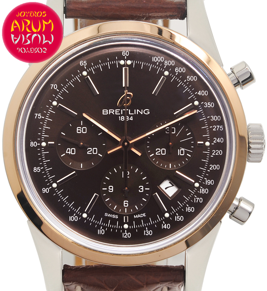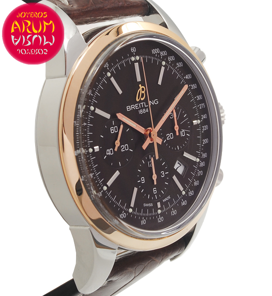 Other specifications :calibre Breitling 01, power reserve 70 hours, steel case and 18K rose gold bezel, chronograph, date, small seconds at nine, luminous marks. Year 2015.
