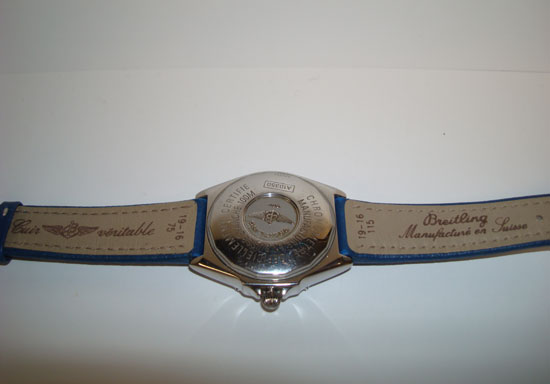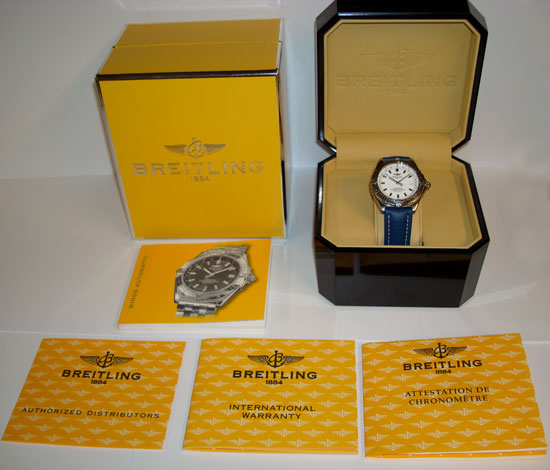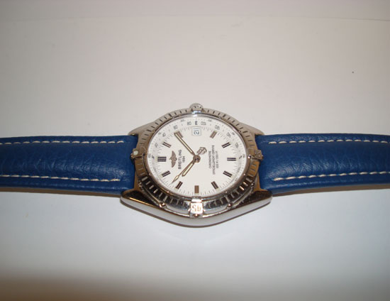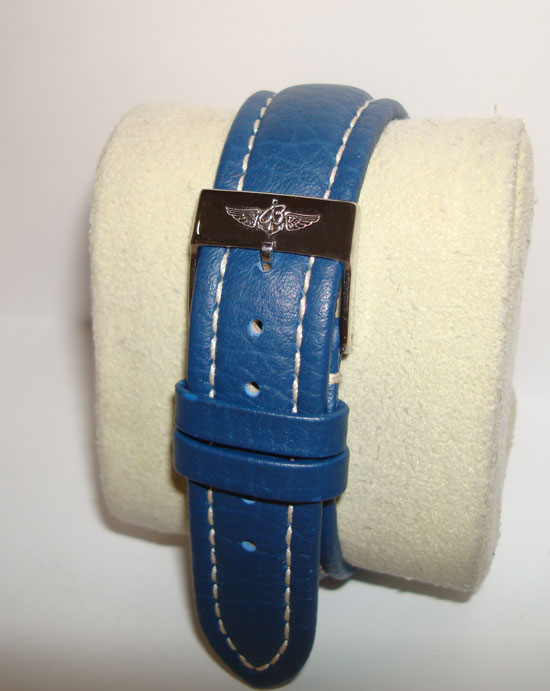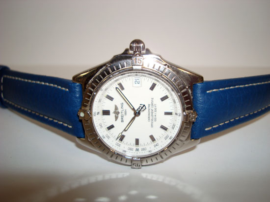 Description :steel, white dial, sapphire crystal, unidirectional rotating bezel, automatic movement, center seconds, luminescent handles, date at three, 37 mm diameter, water-resistant 100 meters, blue leather strap, steel buckle closure.