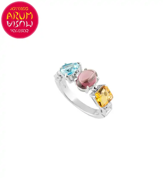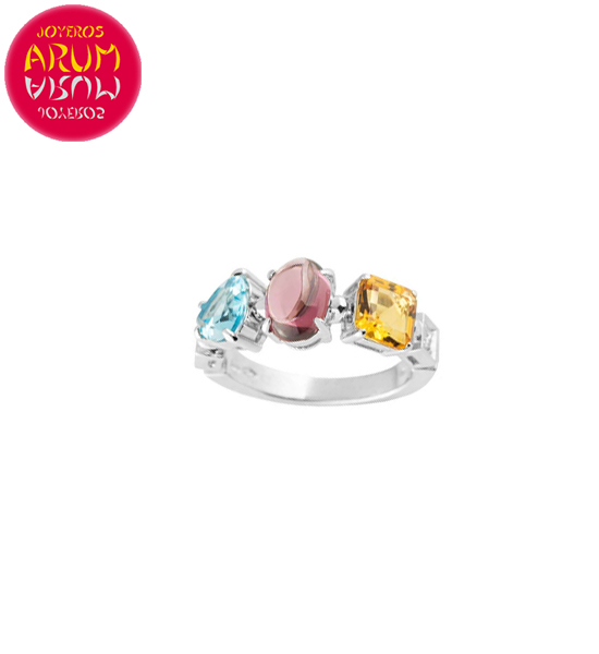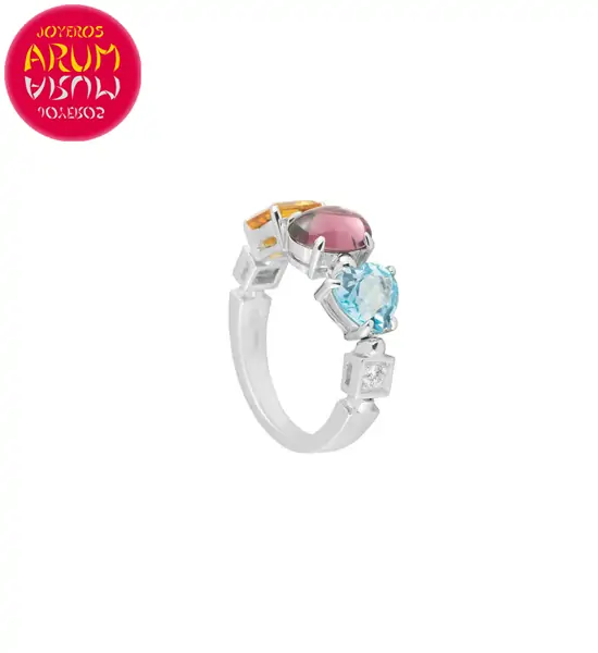 Description: Bulgari Allegra ring made in 18K with gold, with two diamonds (0.08 ct), and three gemstones, citrine, topaz and tourmaline.