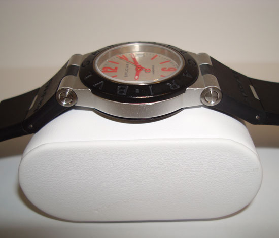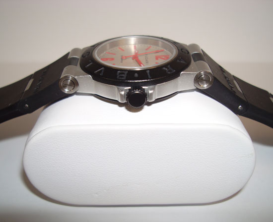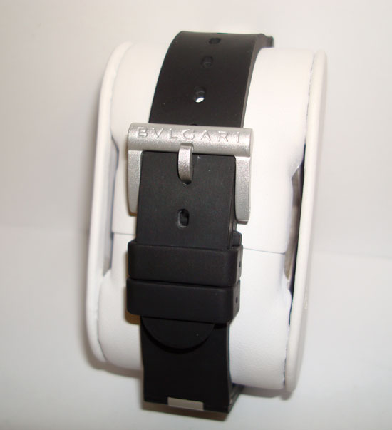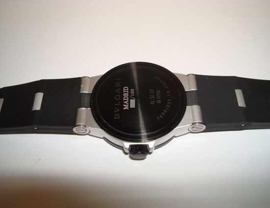 Description :limited edition 100 pieces, aluminum, bezel with Bulgari letters, white dial, center seconds, quartz movement, sapphire crystal, date at three o’clock, screw crown, diameter 32 mm, rubber strap and aluminum, aluminum buckle closure.