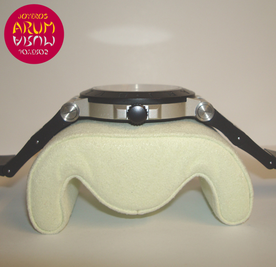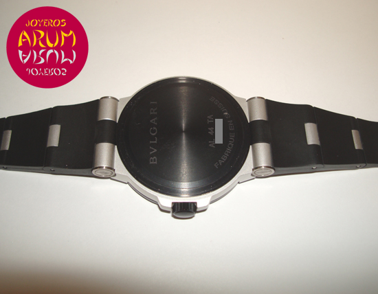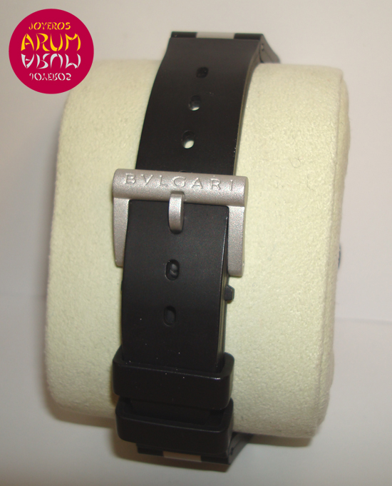 Description :aluminum, white dial, rubber bezel engraved with letters Bulgari, sapphire crystal, automatic movement, center seconds, luminescent handles with indicators, date at three, screwed crown, diameter 44 mm, rubber strap, buckle closure.