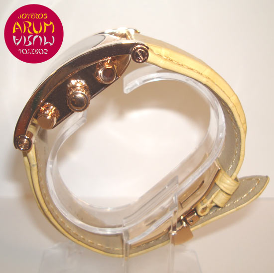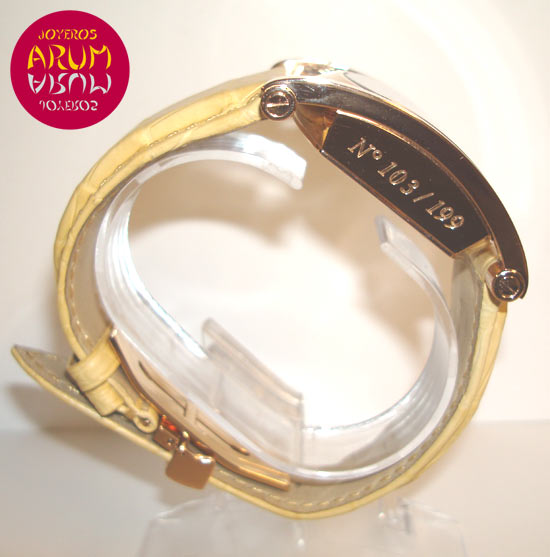 Description :limited to 199 pieces, pink gold, gray dial, sapphire crystal, automatic movement, chronograph, three indicators on the dial, seconds, minutes, hours, date between four and five, luminescent handles, screw crown and two pushers at right, diameter 38 mm by 48 mm, waterproof 50 meters, beige leather strap, rose gold folding clasp, year 2007.