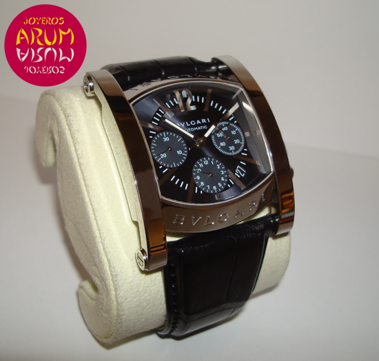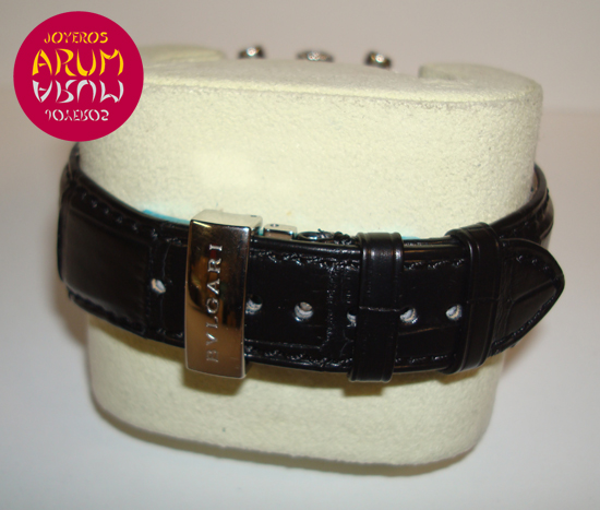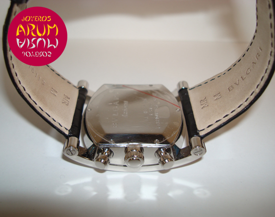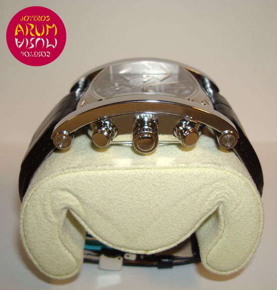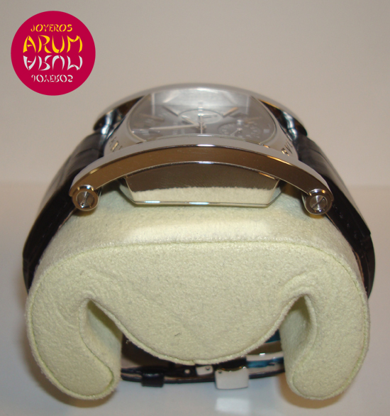 Description :steel, black dial, sapphire crystal, automatic movement, smooth bezel, chronograph, three indicators on the dial, date between four and five, handles with luminescent indicators, screw crown and two buttons at right, 37.5 mm diameter, leather black strap, steel folding clasp, year 2007.