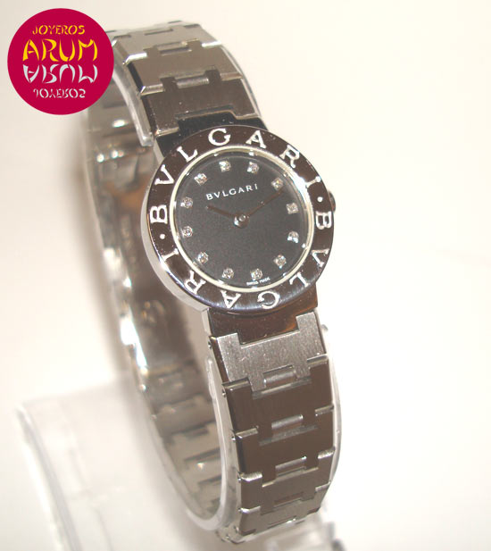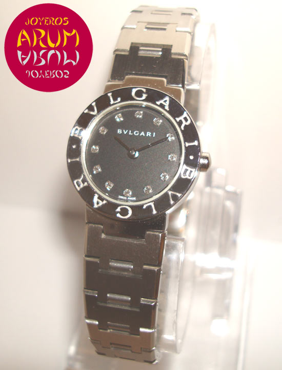 Description :ladies watch, steel, black dial with diamonds, bezel engraved with letters Bulgari, sapphire crystal, quartz movement, crown at right, diameter 23 mm, steel strap, hidden folding clasp, year 2008.