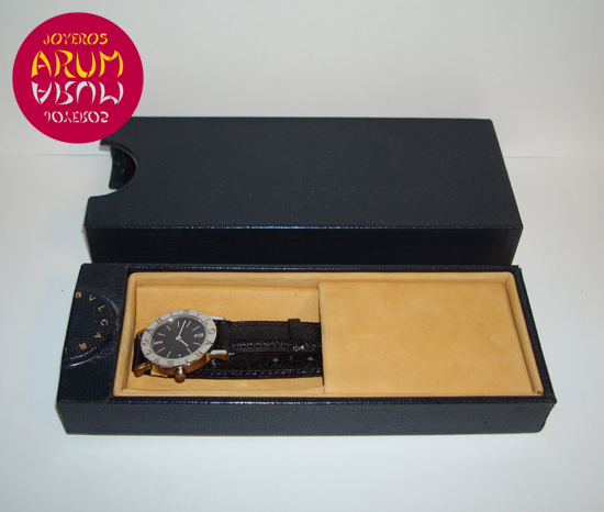 Description :lady’s watch, steel, bezel engraved with letters Bulgari, black dial, sapphire crystal, quartz movement, date at three, diameter 26 mm, black leather strap, steel buckle closure.