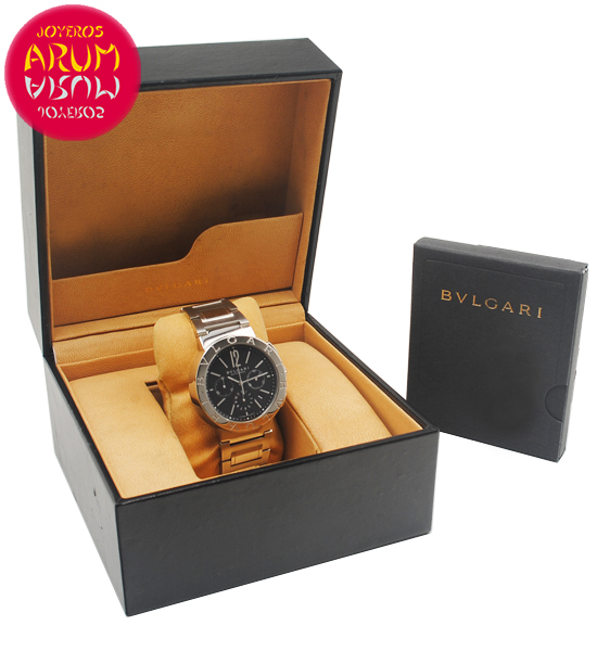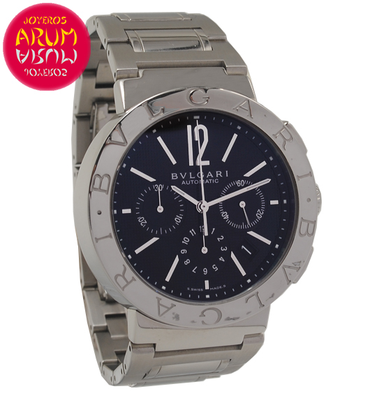 Other specifications :smooth bezel with Bulgari letters, chronograph, date between four and five, small seconds at three, hour counter at six, minute counter at nine. Year 2010.
