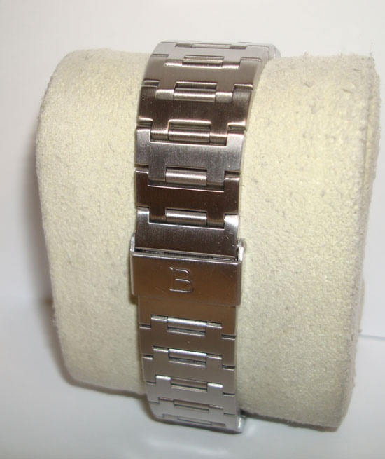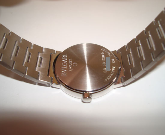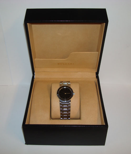 Description :steel, black dial, bezel engraved with letters Bulgari, sapphire crystal, quartz movement, diameter 30 mm, screw crown, strap steel, folding clasp.
